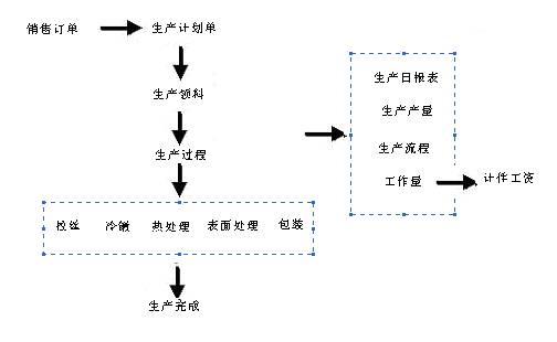 2、 系統(tǒng)主要完成訂單管理、生產(chǎn)任務(wù)下達(dá)、各工序(拉絲、冷鐓、熱處理、表面處理、包裝等)生產(chǎn)情況(包括流程及庫存)管理