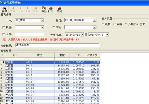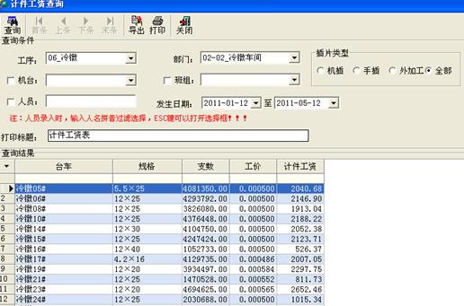 j) 各車間工序工作量自動計(jì)算,工價(jià)設(shè)置好后,能自動計(jì)算計(jì)件工資。如下圖: