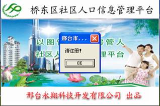 本《平臺》安裝后,需要注冊,才能正常使用,本《平臺》的注冊包含兩個概念,1、是注冊單位(即哪個社區(qū)使用);2、注冊碼注冊,本軟件使用注冊碼方式注冊使用。