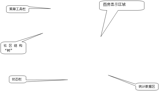 如圖6.1所示,軟件主界面包含5部分:1、菜單工具欄;2、社區(qū)結(jié)構(gòu)“樹”;3、 “圖房顯示區(qū)域”;4、統(tǒng)計數(shù)據(jù)區(qū);5、狀態(tài)欄。