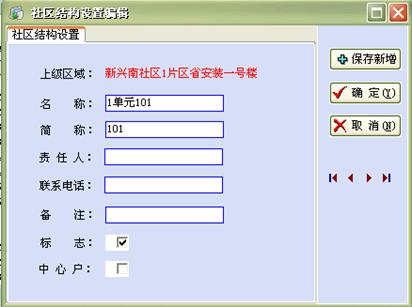 社區(qū)結(jié)構(gòu)中包含名稱、簡稱、責(zé)任人、聯(lián)系電話、備注、標(biāo)志、中心戶幾項。如下圖: