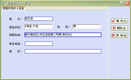 (四)錄入和修改數(shù)據(jù)方便、簡單,考慮到社區(qū)操作人員的素質(zhì),軟件在設(shè)計之初就考慮到了錄入和修改數(shù)據(jù)簡便的問題。通過“圖和房”界面,直接錄入和修改“人戶”信息。通過統(tǒng)計查詢結(jié)果也能直接錄入和修改“人戶”信息。