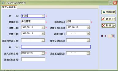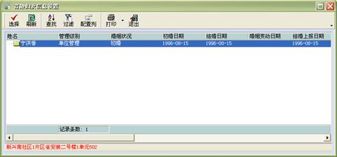 計劃生育信息報告單中包含:結(jié)婚情況、現(xiàn)孕情況、出生情況、避孕情況、其他(離婚喪偶遷入遷出死亡等)情況。本軟件分五部分查詢。