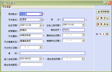 已婚育齡婦女的子女信息通過此功能模塊實現(xiàn)。如圖2.12 所示。需要錄入的項目包括:育婦姓名、子女姓名、孩次、出生日期、出生上報日期、政策屬性、準(zhǔn)生證號碼/結(jié)論證號碼、子女屬性、屬性發(fā)生日期、子女健康狀況、健康變化日期、子女死亡日期、備注、進入系統(tǒng)日期、退出系統(tǒng)日期、退出系統(tǒng)原因。