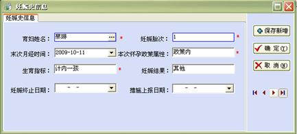 已婚育齡婦女的妊娠信息通過此功能模塊錄入,如圖2.15 所示。妊娠信息包括:育婦姓名、妊娠胎次、末次月經(jīng)時間、本次懷孕政策屬性、生育指標(biāo)、妊娠結(jié)果、妊娠終止日期、措施上報日期。如圖2.16 所示。