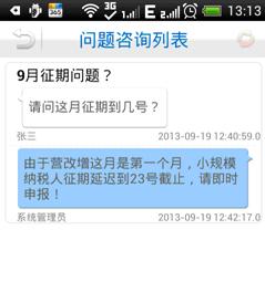 對(duì)于前面納稅人提交的問題“請(qǐng)問這月征期到幾號(hào)?”,稅務(wù)機(jī)關(guān)做了答復(fù),納稅人可以通過“問題查詢”功能查詢提交的問題答復(fù)是“由于營改增這月是第一個(gè)與,小規(guī)模納稅人征期延遲到23號(hào)結(jié)束,請(qǐng)及時(shí)申報(bào)”。