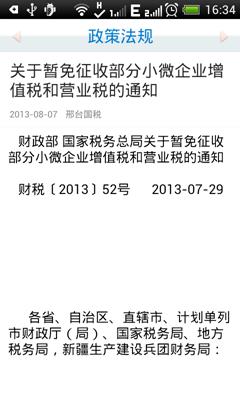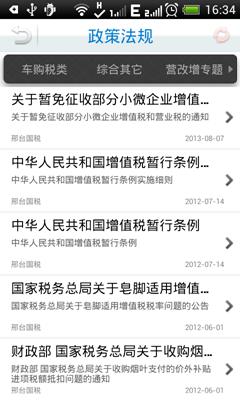 政策法規(guī)包括增值稅類、所得稅類、消費(fèi)稅類、車購稅類、綜合其它、營改增專題等六大類,提供最新最全的政策法規(guī)信息。如圖2.34所示。