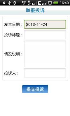 本系統(tǒng)提供在手機(jī)端實(shí)現(xiàn)投訴舉報(bào)的功能,納稅人可以把需要投訴舉報(bào)的信息按照格式要求填寫后,提交;相應(yīng)后臺(tái)管理人員(稅務(wù)機(jī)關(guān)人員),會(huì)根據(jù)具體舉報(bào)投訴的內(nèi)容作相應(yīng)處理,如圖2.36所示。