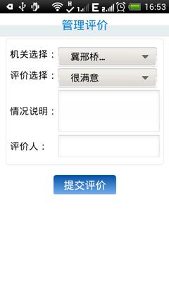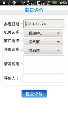 選擇辦理日期、稅務(wù)機(jī)關(guān)、窗口、評(píng)價(jià)類型,錄入具體情況說明、評(píng)價(jià)人后點(diǎn)擊“提交評(píng)價(jià)”按鈕,實(shí)現(xiàn)對(duì)某一辦稅服務(wù)廳窗口的評(píng)價(jià)。